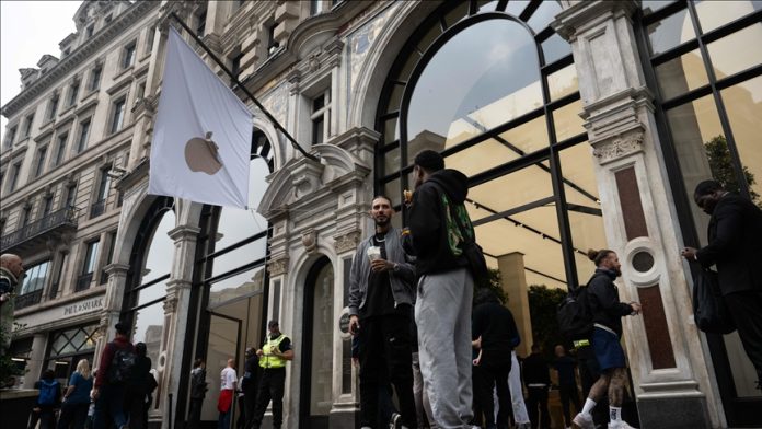 Para demonstran menggelar protes di depan toko Apple di pusat London pada Sabtu, (21/9), menyerukan agar masyarakat tidak membeli produk yang dianggap “mendukung genosida.”