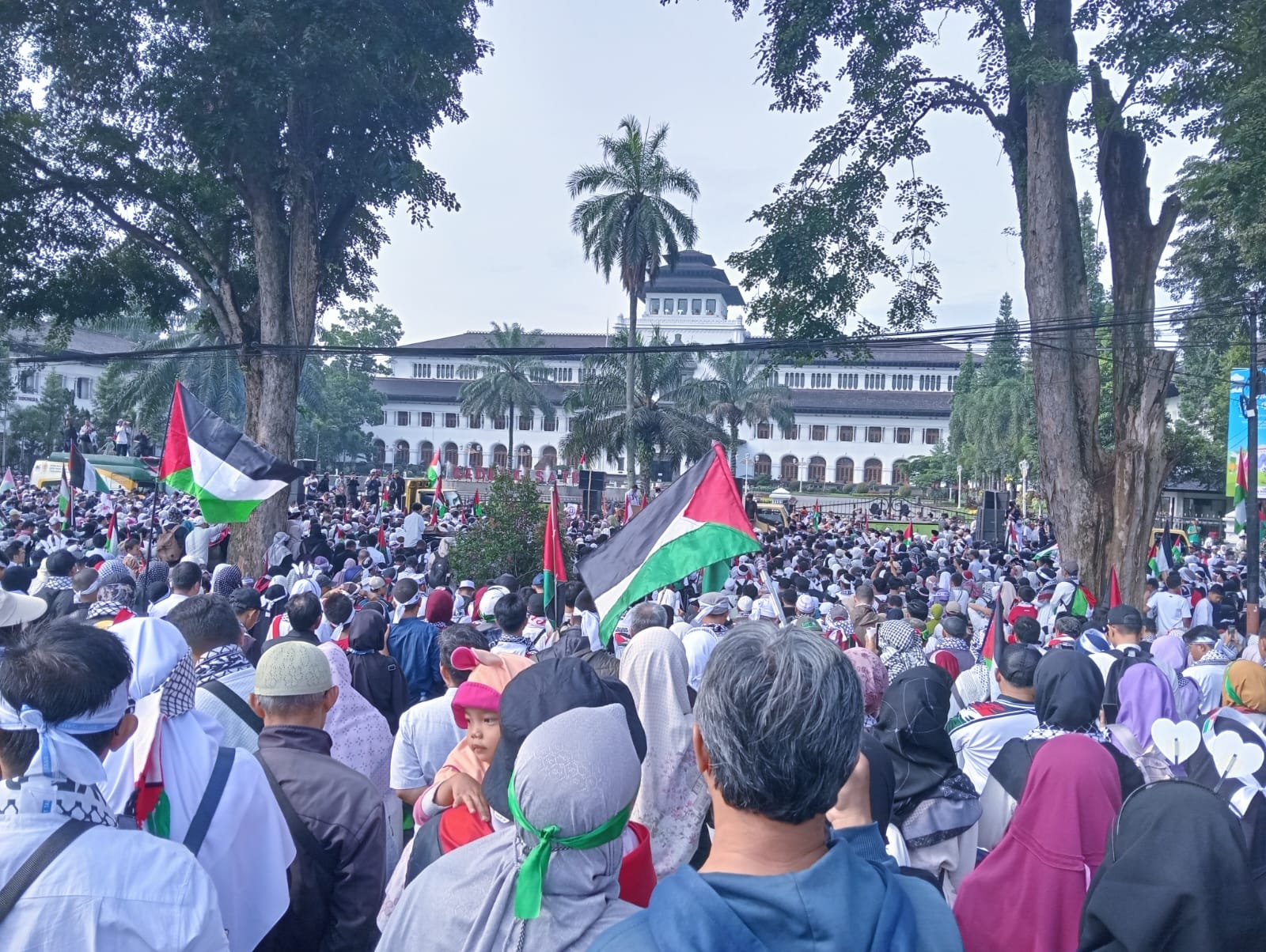Puluhan ribu warga Jawa Barat menggelar aksi solidaritas untuk Palestina di Bandung, Jawa Barat pada Ahad (20/4).