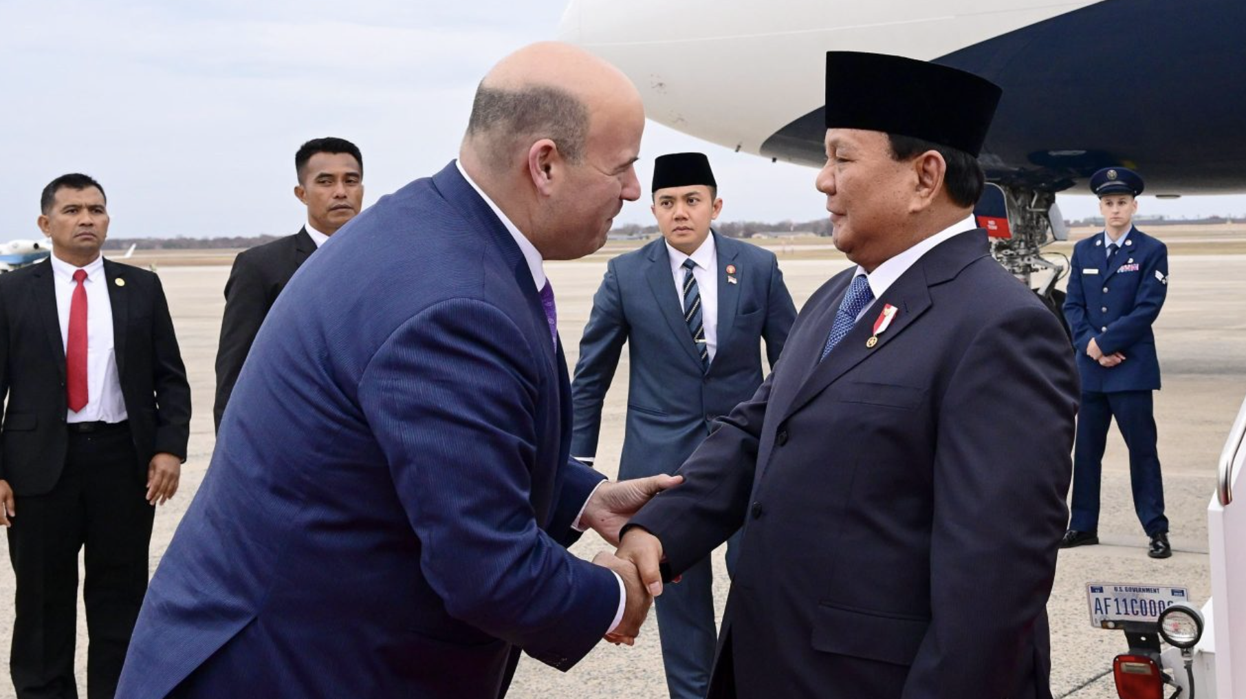 Kedatangan Prabowo disambut oleh Penjabat Kepala Protokol Amerika Serikat Ethan Rosenzweig, Duta Besar Amerika Serikat untuk Republik Indonesia Kamala Shirin Lakhdhir, KUAI KBRI Washington DC Ida Bagus Made Bimantara, Atase Pertahanan KBRI Washington DC Marsma TNI Wisoko Aribowo, dan Korfung Protkons KBRI Washington DC Gustaav Ferdinandus.