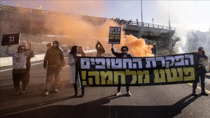 Para pengunjuk rasa, bersama aktivis, menutup Jalan nomor “1”, yang merupakan jalan utama yang vital, untuk menuntut agar perjanjian Gaza segera dilaksanakan tanpa hambatan.