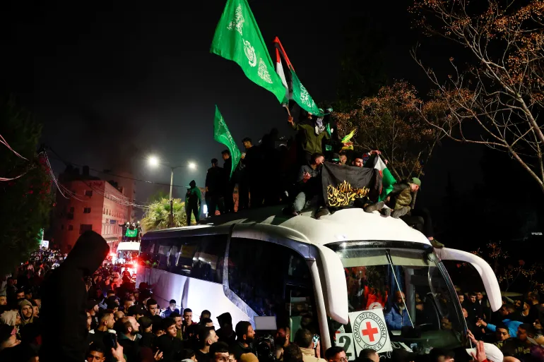 Bus-bus tersebut mengangkut sebagian dari 90 tahanan yang dibebaskan sebagai bagian dari kesepakatan gencatan senjata Gaza yang dimulai pada Ahad lalu, yang juga menyaksikan pembebasan tiga sandera Israel oleh Hamas.