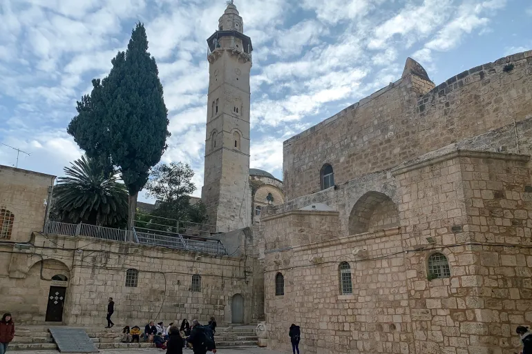 Di tengah riuhnya jalanan sempit Kota Tua Yerusalem, tak jauh dari gereja paling suci bagi umat Kristiani—Gereja Makam Kudus—berdiri tegak sebuah bangunan bersahaja namun sarat makna: Masjid Umar bin Khattab.