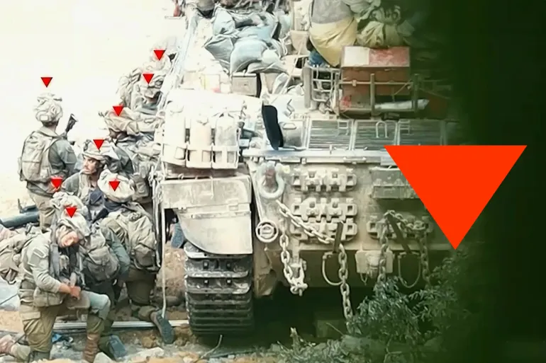 Salah satu elemen ikonik yang sering muncul dalam dokumentasi Al-Qassam adalah “segitiga merah terbalik”, yang digunakan untuk menandai tentara dan kendaraan Israel dalam operasi serangan atau penyergapan.