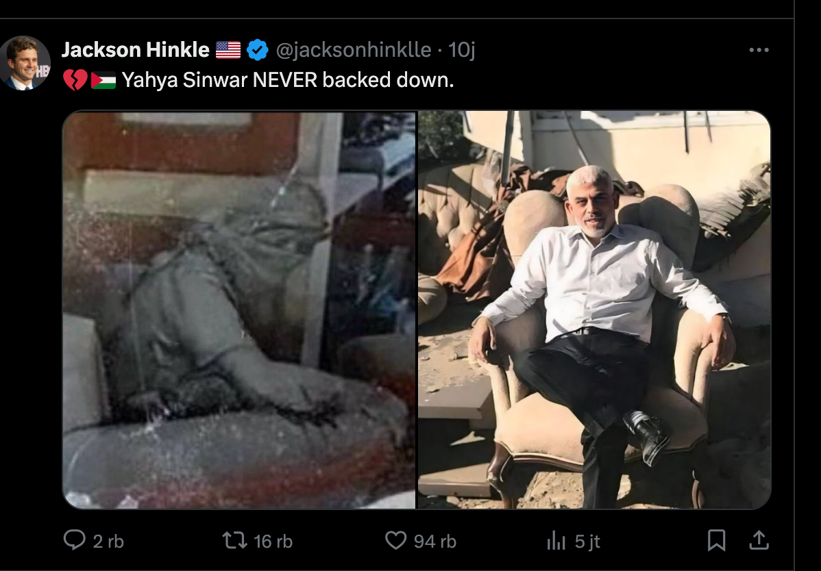 Seorang komentator politik AS, Jackson Hinkle juga memuji Sinwar. “Dia hidup sebagai pemimpin, Dia gugur sebagai tentara,” tulisnya di akun X, @jacksonhinklle.